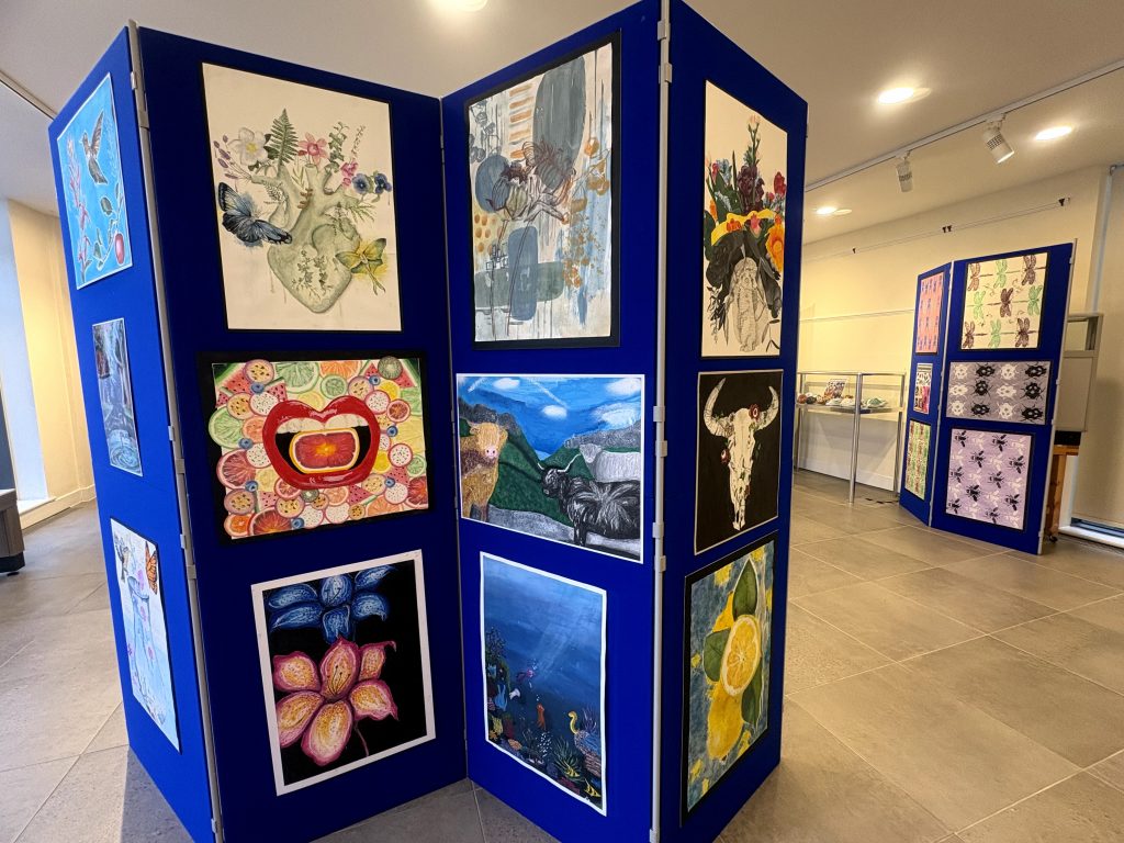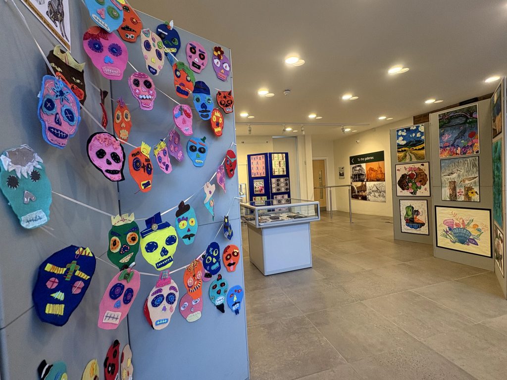Also on show is a selection of Year 8 work Inspired by Mexican Sugar Skulls. Sugar skulls, or calaveras de azúcar, are colourful, decorated sugar confections representing departed souls, central to Mexico’s Día de los Muertos (Day of the Dead) for honouring loved ones. Made from sugar paste and decorated with icing, foil, and glitter, they’re placed on altars (ofrendas)* or given as gifts, symbolizing life’s temporary nature and the joyful remembrance of the deceased, not something morbid.